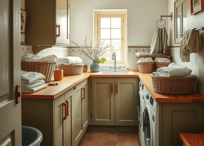 Transform your laundry space into a cozy haven with warm wood cabinetry and softly painted walls. A simple countertop provides the perfect spot for sorting, while a basket of fresh linens adds a welcoming touch. Let sunlight flood in through a small window, creating an inviting atmosphere that makes laundry day a pleasure. 🌞🧺✨